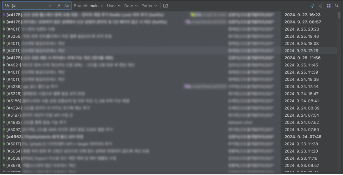 이로 인해 merge commit으로 인한 main 브랜치의 타임라인은 지저분해졌으며 특정 이슈에 대한 커밋이 push 된 시점으로 섞여있기에 한눈에 개선 건의 diff를 확인하기 어려웠다. 😢