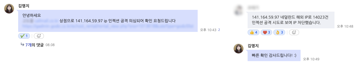 또한, 인젝션 공격이 발생했을 때는 웹훅을 통해 먼저 인지하여 웹 로그를 분석해 데브옵스에 IP 차단을 요청한 경험도 있었다. 이 과정에서 다양한 인젝션 공격 패턴을 경험할 수 있었고, 생소한 표현식은 직접 검색해보며 관련 지식도 함께 쌓을 수 있었다.