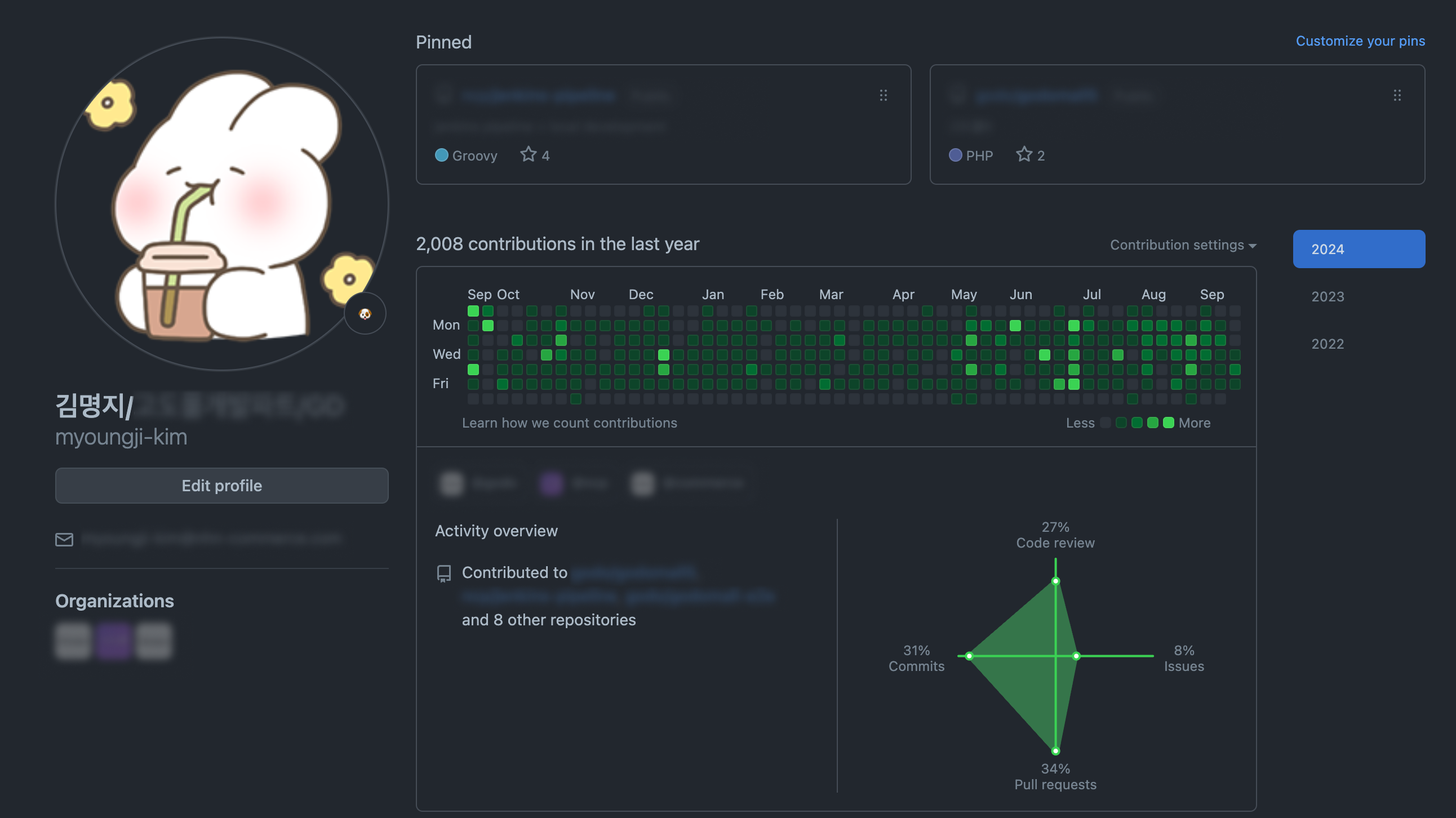 내 노력의 흔적은 깃헙 잔디밭에서도 확인할 수 있다 ㅎㅎ (최근 1년 간 약 2,000 건의 기여)