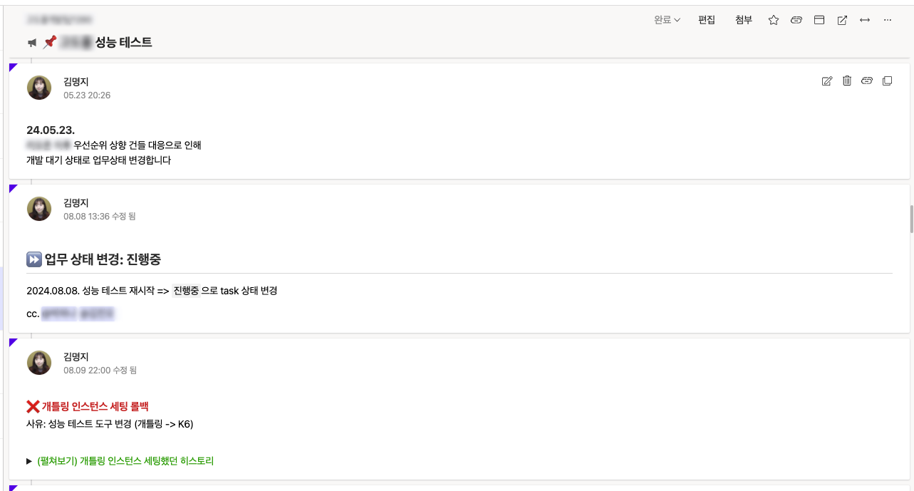과거 Task 히스토리를 살펴보면, 아무런 코멘트 없이 '완료'로만 표시된 경우가 종종 있었다. 이런 경우 나중에 히스토리를 다시 확인하려 할 때 어려움이 많았다. 그래서 나는 업무를 관리할 때 실시간으로 업무 상태 태그(ex. 개발 진행, QA 진행 등)를 업데이트하고, 이벤트 소싱처럼 모든 중요한 진행 상황을 코멘트로 기록하는 습관을 들였다.