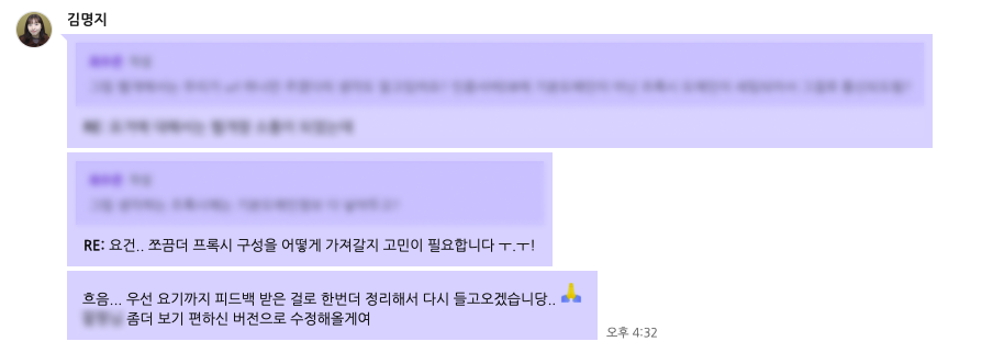 그래서 나는 보충이 필요한 부분에 대해서는 Task에 즉각적으로 피드백을 반영한 후, 메신저는 보조적인 소통 수단으로 활용하고 있다. 즉, Task에 작성된 내용을 중심으로 논의가 이루어질 수 있도록 노력하고 있다.