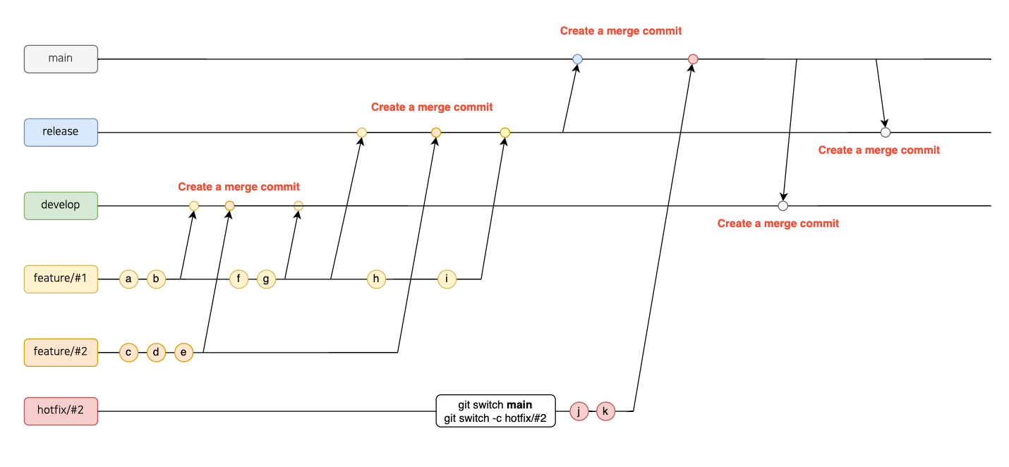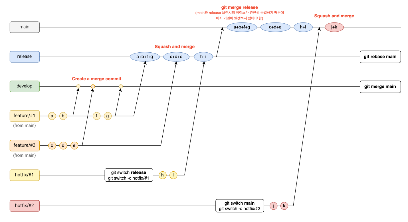 당시 파트의 Git Flow는 모든 병합 방식이 "Create a merge commit"이었다. 그리고 main 브랜치로 리얼 배포가 나간 다음, QA 공용 브랜치(release, develop)를 최신화하기 위해 다시 역방향으로 "Create a merge commit"을 해주었다.