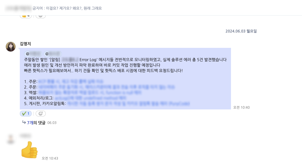 : "네, 말씀하신 특정 입력값이 들어올 경우 {@} 에러가 발생하는 것을 확인했습니다. 예외 처리가 가능하도록 수정했습니다." (✅)