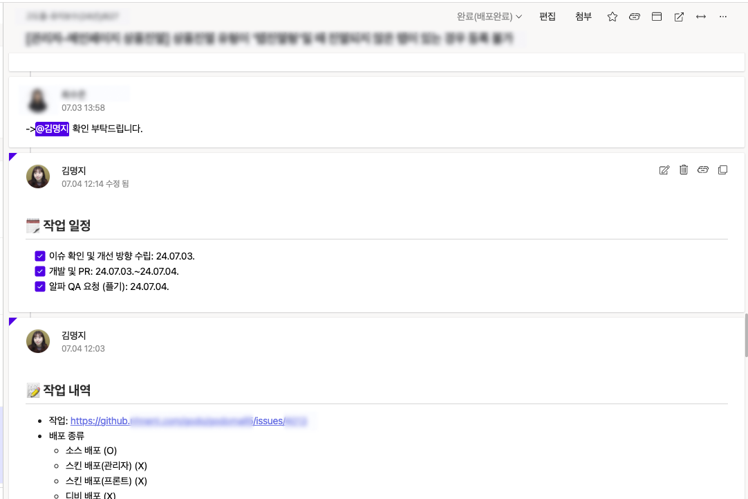 꼼꼼하게 기록을 남기는 습관 덕분에 Task 링크만 공유해도 업무 진행 상황을 쉽게 전달할 수 있어 불필요한 소통을 줄일 수 있었고, 이후 내가 진행했던 업무의 히스토리를 확인할 때도 과거 이슈, 논의 내용, 개선 방향성, 일정 지연 사유 등을 명확하게 확인할 수 있어 업무 대응이 훨씬 편해졌다 😊