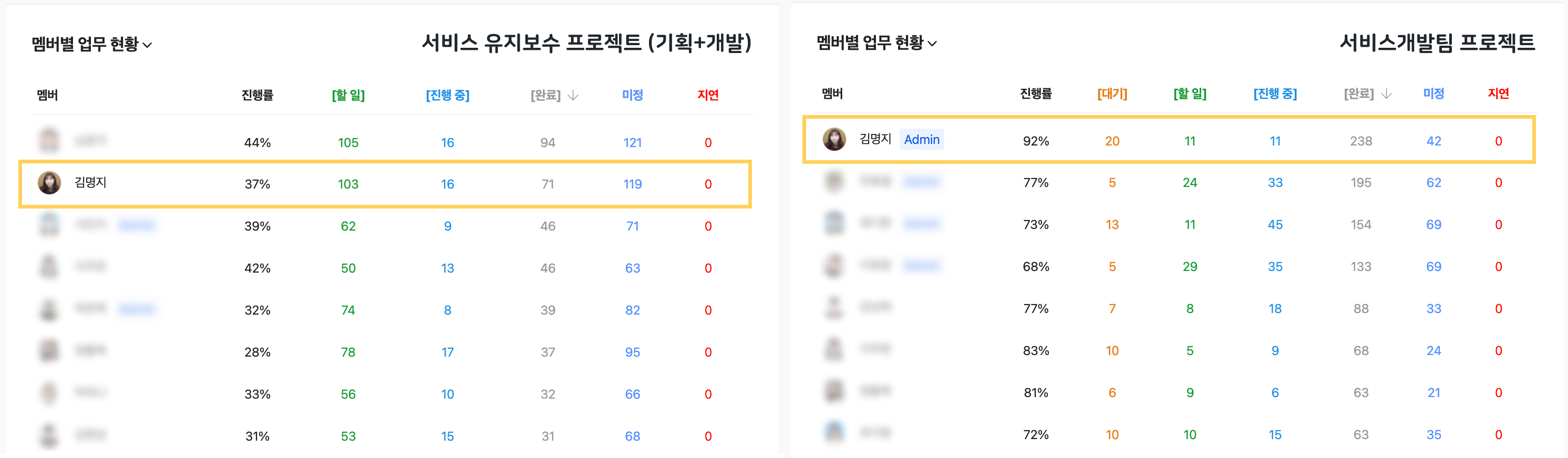 또한, 가장 많이 사용하는 프로젝트의 대시보드를 통해 멤버별 업무 현황을 살펴봤을 때, 기획과 개발이 함께 사용하는 유지보수 프로젝트와 내가 속한 개발팀의 프로젝트(주로 유지보수 외의 추가 개선 업무를 다루는 프로젝트) 모두에서 내 업무 완료 수가 1위였다.