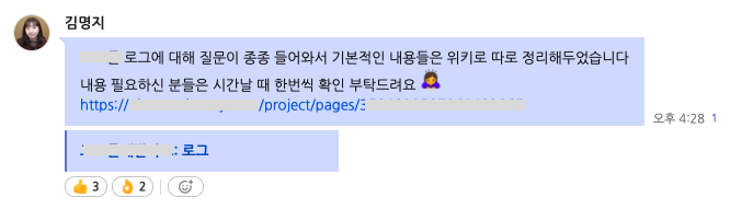 덕분에 지금은 공유하고자 하는 내용을 메신저 전달이 아닌, 위키 작성으로 하는 문화로 잘 자리 잡아가고 있다.